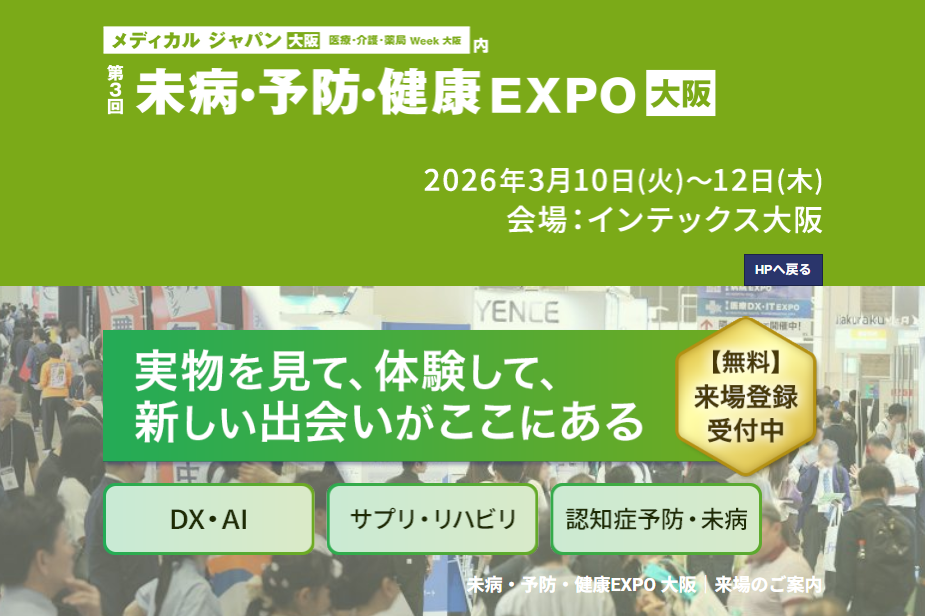 未病・予防の専門展示会。健康管理アプリ、健康サポートシステム、トレーニング機器、フィットネス機器、リハビリ用品、健康食品、サプリメント、睡眠管理、ヘルスケアDXなどが出展。薬局・ドラッグストア、クリニック、自治体、健診センター、健康・運動施設、介護予防施設などが来場。3月大阪で開催 同時開催展あり。来場登録はこちらVIP来場登録はこちら(課長職以上の方)