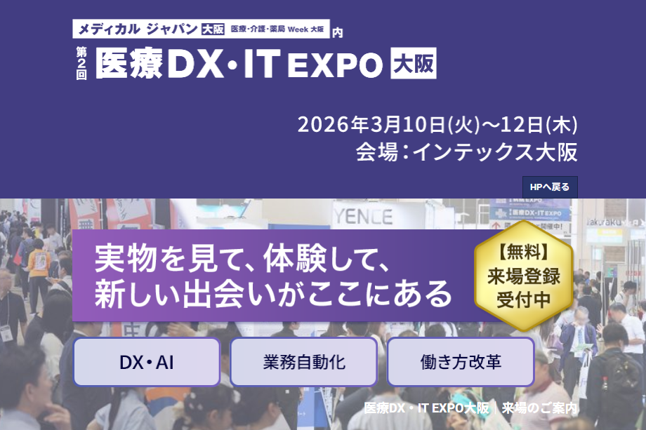 日本最大級の医療DXの専門展示会。人工知能(AI)診断支援、デジタルヘルス、ロボット・RPA、遠隔医療支援、電子カルテ・クラウド、地域連携システム、サイバー攻撃対策ツールなどが出展。病院・クリニックなどの医療機関が多数来場します。3月東京で開催。 同時開催展あり。来場登録はこちらVIP来場登録はこちら(課長職以上の方)