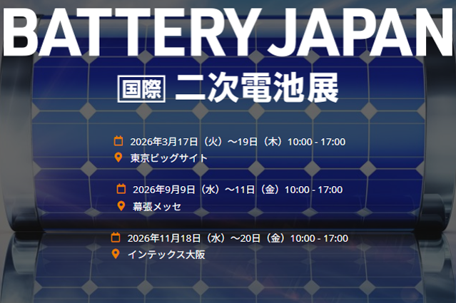 2026年3月17日(火)から東京ビッグサイトで『BATTERY JAPAN【春】~第20回 [国際] 二次電池展~』を開催!世界中から部品・材料、材料開発支援、評価・測定・検査、製造装置・付帯設備、バッテリーマネジメントシステム、二次電池・キャパシタが出展。技術的な商談が活発に行われます。 同時開催展あり。来場登録はこちらVIP来場登録はこちら(課長職以上の方)