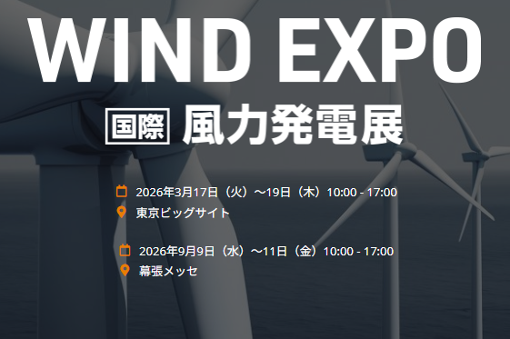 2026年3月17日(火)から東京ビッグサイトで『WIND EXPO【春】~第17回 [国際] 風力発電展~』を開催!世界中から風力発電関連の部品・駆動装置、施工・輸送、解析・計測、洋上風量技術、メンテナンス会社、大型・小型風車などが出展。技術的な商談が活発に行われます。 同時開催展あり。来場登録はこちらVIP来場登録はこちら(課長職以上の方)