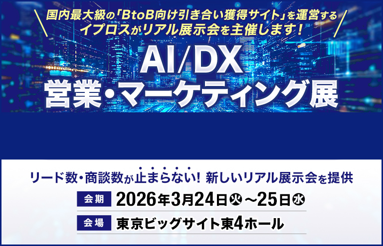国内最大級のBtoBマッチングプラットフォームを運営するイプロスが主催。営業・マーケティングの現場で「いま使うべきAIがわかる」展示会です。イプロス独自の手法で来場者の課題を可視化し、成果につながる最適なソリューションとマッチング。また著名講師やAI最先端を熟知する協会によるセミナーも併設。初心者から上級者まで、AI/DXを使った次の一手が見つかります。