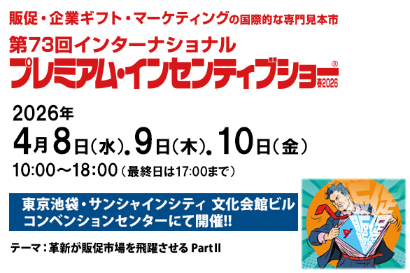 販促・企業ギフト・マーケティングの国際的な見本市「インターナショナル プレミアム・インセンティブショー」です。企業の商品企画担当者、広告代理店、SP(セールスプロモーション)担当者などの有力バイヤーが来場し、懸賞景品、ノベルティ、記念品、最新の販促ツールやシステムなどを探すための、ビジネス商談に特化したイベントです。