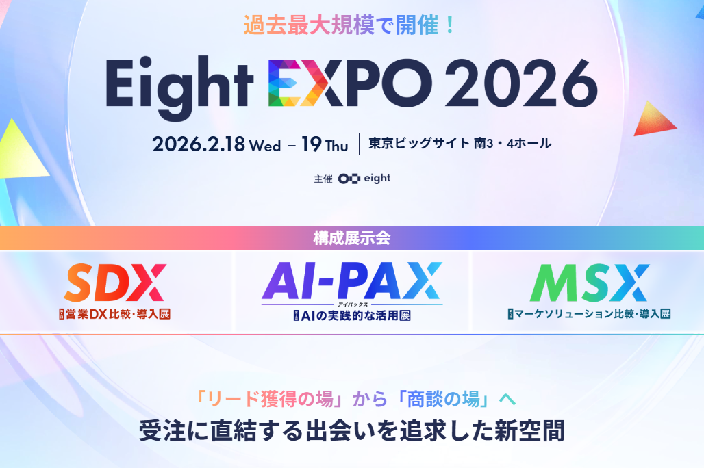 SDXは、営業の効率化やオートメーション化を推進する担当者らが参加し、交流や商談が活発に行われます。また、AIコンシェルジュを導入し「多くの有効商談を創出するイベント」として業界の支持を受けています。従来の展示会とは一線を画し「リード獲得の場から、商談の場へ。」を実現する唯一の商談展です。本展はEight EXPO 2026の構成展の一つです。 同時開催展あり。
