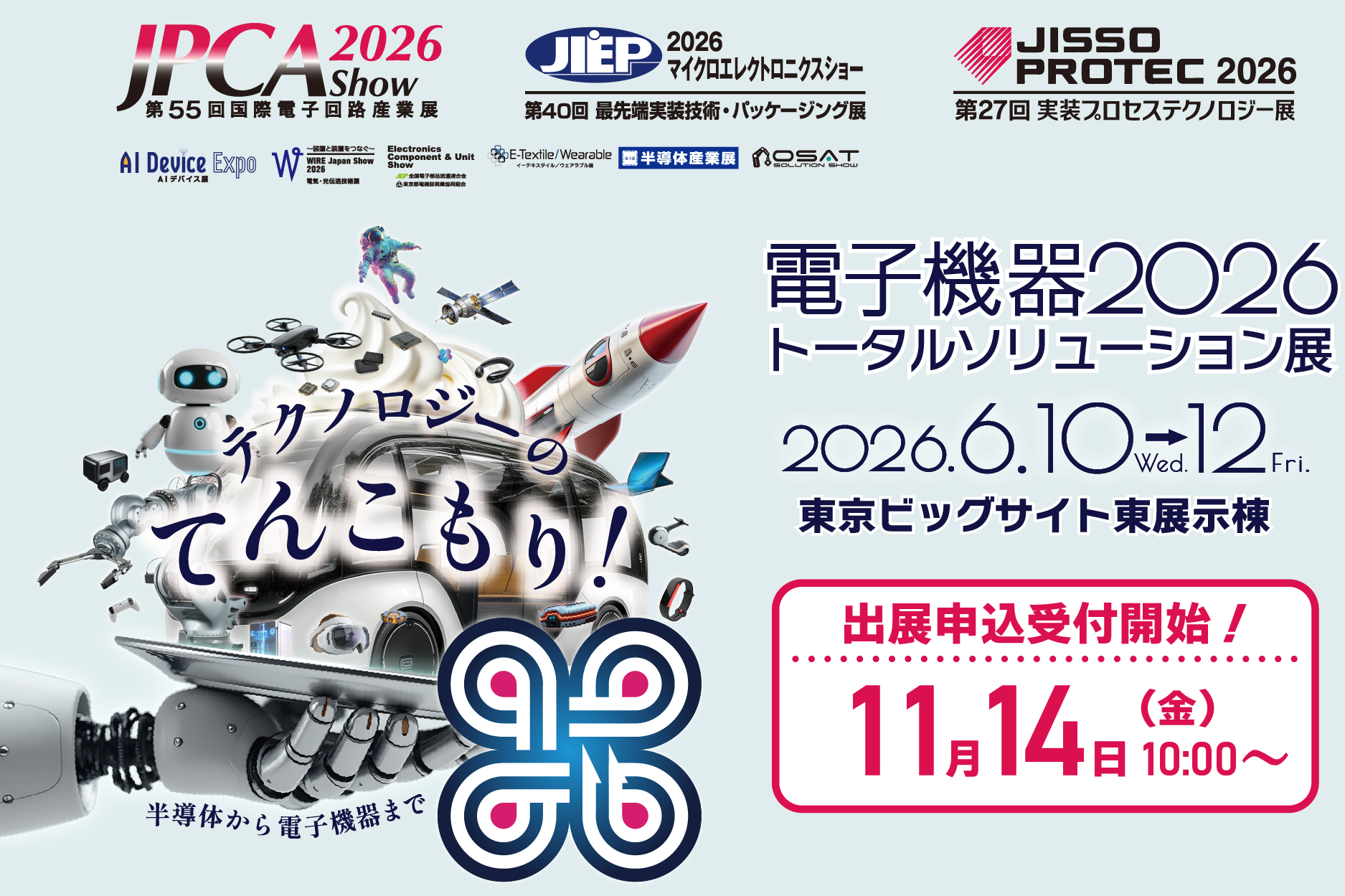 あらゆる電子・情報通信・制御機器に使用される電子回路・実装技術や、用途の広がりを見せるセンサー・E-Textile(ウェアラブル技術)等の新しいコンテンツとソリューション等の展示を加え、技術情報の提供・提案をはかり、併せて電子回路業界及び関連業界全体の発展に寄与する展示会です。