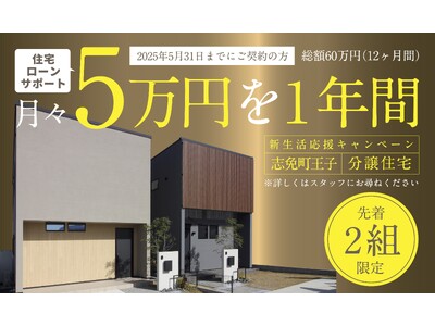 先着2組限定キャンペーン|5月31日までのご契約で、月々5万円×1年間の住宅ローンサポート!