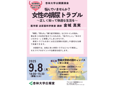 杏林大学(所在地:東京都三鷹市)は9月8日(月)、医学部 金城真実講師による講演会「悩んでいませんか?女性の排尿トラブル~正しく知って快適な生活を~」を実施します。
