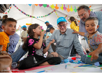 (C) UNICEF/UNI844883/Fazel西部ヘラート近郊のイスラムカラ受け入れセンターにユニセフが設置した「子どもにやさしい空間」で、子どもたちと交流するユニセフ事務局次長のテッド・チャイバン(アフガニスタン、2025年8月5日撮影)