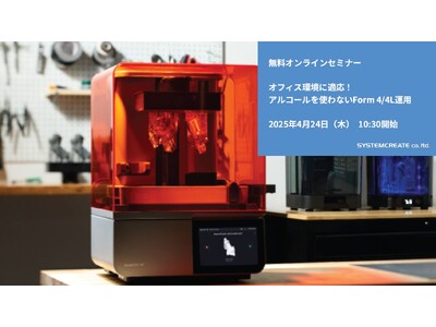 世界のものづくりツールの販売を手掛ける総合技術商社、株式会社システムクリエイト(本社:大阪府東大阪市荒本新町、代表:川上正義)は、2025年4月24日(木)10:30に、無料オンラインセミナー「オフィス環境に適応!アルコールを使わないForm 4/4L運用」を開催いたします。