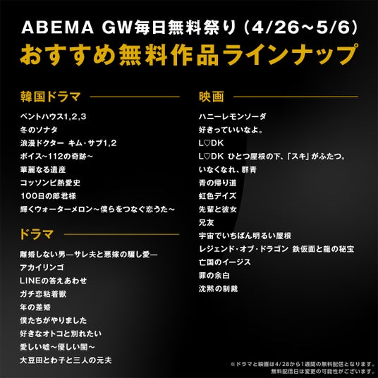 新しい未来のテレビ「ABEMA(アベマ)」は、ゴールデンウィーク期間中、韓国ドラマ、人気バラエティ番組、恋愛リアリティショー、映画など人気作品を無料配信することを決定いたしました。