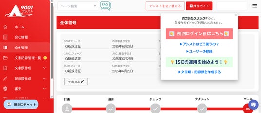 「ISOの自社運用で苦労が多い」「これからPマークを新規取得しようと考えている」「担当者の負担を減らしたい」という方へ向け、累計8,000社以上のISO/Pマークの取得・運用支援をしている弊社が、これまで蓄積してきたISO/Pマーク管理に対する多数の悩みをもとに開発。文書作成・記録作成といったISO/Pマーク取得・運用で煩雑だった審査前の書類を一元管理できる他、市場価格よりもリーズナブルに進捗管理やガイド機能により時間を大幅に節約できます。