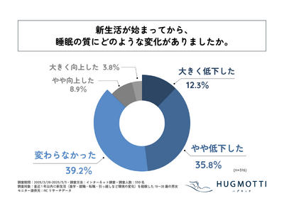 春は、多くの人にとって新生活が始まる季節です。進学や就職、転職、引っ越しなど、環境の変化に直面する人が増える時期でもあります。こうした新たなスタートは期待や希望に満ちたものですが、その一方で生活リズムの変化や新しい人間関係、慣れない環境がストレスとなり、心身に負担を与えることも少なくありません。特に睡眠の質は、こうした変化の影響を受けやすいと考えられます。新しい住環境での寝具の違いや、仕事・学業のプレッシャーによる精神的な緊張は、寝つきの悪さや夜中の中途覚醒を引き起こし、結果的に日中のパフォーマンス低下にもつながる可能性があります。では、実際に新生活を迎える人々は、どのような要因で睡眠の質が低下していると感じているのでしょうか。 また、その改善に向けてどのような対策を考えているのでしょうか。そこで今回「ハグモッチ」は、直近1年以内に新生活(進学・就職・転職・引っ越しなど環境の変化)を経験した18~39歳の男女を対象に、「新生活と睡眠の質」に関する実態調査を実施しました。