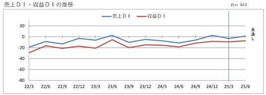 2025年4-6月期は、売上DIが4.2ポイント、収益DIが2.1ポイント、販売価格DIが4.0ポイント、販売数量DIが2.4ポイントそれぞれ上昇すると予測しています。