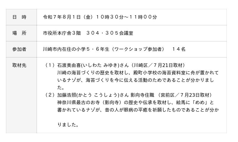 川崎市では、従来の学術的・専門的な「川崎市史」の編さんに先行して、昨年迎えた市制 100 周年を記念し、市民参加による新しい「川崎の歴史の本」を制作しています。この度、小学生が記者として、川崎の海苔づくりの歴史と神奈川県最古のお寺の歴史や伝承を取材した結果を市長へ報告しました。