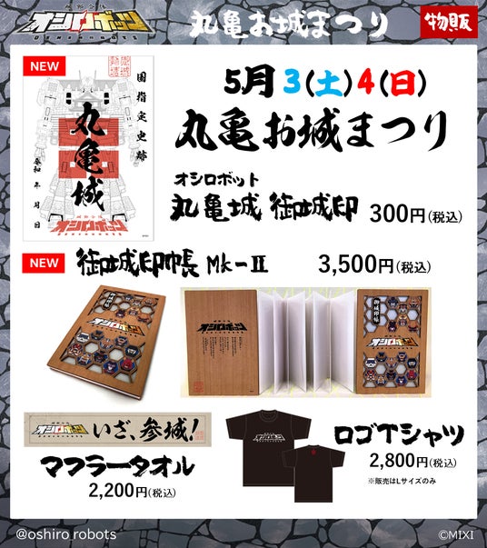株式会社MIXI(東京都渋谷区、代表取締役社長 上級執行役員 CEO:木村 弘毅)は、MIXI_ANIMEオリジナルコンテンツ『城郭合体オシロボッツ』のオシロボット「丸亀城」を本日公開しました。また、2025年5月3日(土・祝)、4日(日・祝)丸亀城周辺で開催される「第76回 丸亀お城まつり」にブース出展します。ブースでは、オシロボット丸亀城のトレーディングカードや解説書の配布に加え、新発売となる「オシロボッツ御城印帳 Mk-II」や「オシロボット丸亀城御城印」を含めた物販を行います。