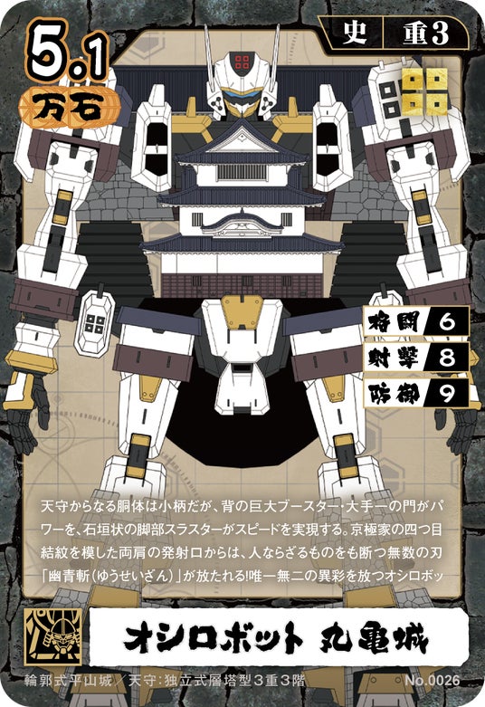 天守からなる胴体は小柄だが、背の巨大ブースター・大手一の門がパワーを、石垣状の脚部スラスターがスピードを実現する。京極家の四つ目結紋を模した両肩の発射口からは、人ならざるものをも断つ無数の刃「幽青斬(ゆうせいざん)」が放たれる!