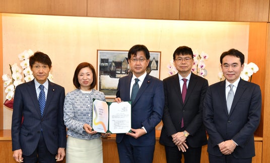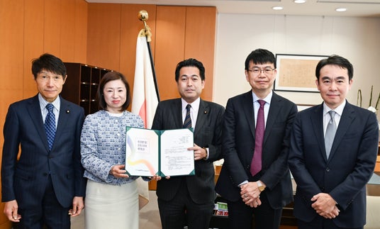2025年2月18日 文部科学省副大臣室で提言書手交を実施。(左から)参議院議員 古川俊治氏、事業構想大学院大学学長 田中里沙、文部科学省 野中厚副大臣、日本再生医療学会理事長 岡野栄之氏、再生医療イノベーションフォーラム代表理事会長 志鷹義嗣氏
