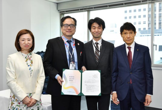 2025年2月28日 経済産業省審議官室で提言書手交を実施。(左から)事業構想大学院大学学長 田中里沙、経済産業省 商務情報政策局 商務・サービス審議官兼商務・サービスグループ長 南亮氏、経済産業省 商務情報政策局 商務・サービスグループ生物化学産業課課長 下田裕和氏、参議院議員 古川俊治氏