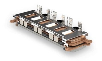 日本初展示となる、ボルグワーナーの改良型両面冷却パワーモジュールは、インバーターの主要なコンポーネントであり、バッテリーから供給される直流電流を電動モーター用の交流電流に変換します。このコンパクトで革新的な設計は、シリコンおよびシリコンカーバイド製のパワートランジスタの両方に対応しており、接合部温度の低減や高い電流密度の実現を可能にします。これにより、効率の向上とインバーターの小型化に寄与しています。