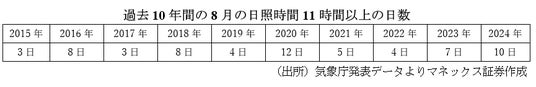 大阪において2015年から2024年までの10年間、日照時間が11時間以上だった8月の平均日数は6.4日でした。