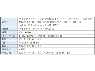 マネックス証券株式会社(本社:東京都港区、取締役社長執行役員:清明祐子、以下「マネックス証券」)は、2025年7月14日(月)(予定)より、年利率が日照時間に連動して決定する債券「マネックスグループ株式会社保証付きマネックスファイナンス株式会社 2026年7月31日満期 日照時間参照型クーポン付 円建社債(愛称:個人向けマネックス債 夏祭り)」の販売を開始いたしますので、お知らせいたします。