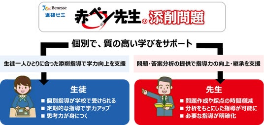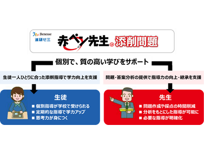 株式会社ベネッセコーポレーション(本社:岡山県岡山市、代表取締役会長兼社長:岩瀬 大輔、以下:ベネッセ)は、「進研ゼミ」の「赤ペン先生の添削指導」サービスを、学校向けに7月より提供開始します。学校向けに赤ペン先生のサービスを展開するのは、1969年の進研ゼミ高校講座開講以来初となります。導入1校目は、難関大学への合格者を多数輩出している神奈川県立横浜翠嵐高校に決定いたしました。ベネッセは、進研ゼミの添削指導を通して長年培ってきた個別指導のノウハウを活かし、学校現場においても生徒一人ひとりに合わせた質の高い指導を提供してまいります。