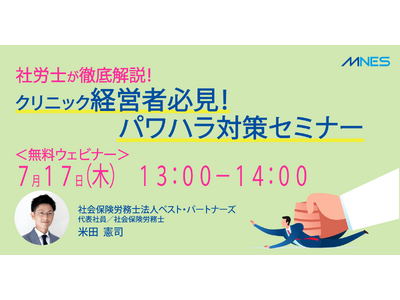 クラウド型医療情報管理共有システム「LOOKREC(※1)」を提供する株式会社エムネス(所在地:広島県広島市、代表取締役社長:阿部 伸一)は、「社労士が徹底解説|クリニック経営者必見!パワハラ対策セミナー」を、2025年7月17日(木)に開催いたします。