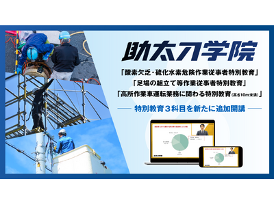 21万超の登録事業者が利用する国内最大級の建設人材マッチングプラットフォームを運営する株式会社助太刀(以下「当社」)は、建設業特化のオンデマンド教育サービスの「助太刀学院」にて、「酸素欠乏・硫化水素危険作業」「足場の組立て等作業従事者」を公開し受講申し込みを開始しました。「高所作業車運転業務」は2025年7月18日に公開・申し込みを開始いたします。それぞれの講座は、職人と工事会社のマッチングプラットフォーム「助太刀」のスマートフォンアプリに登録すると、割引価格で受講ができます。今後も科目を増やし、より多くの方に現場を休まず教育が受けられる環境を提供していきます。