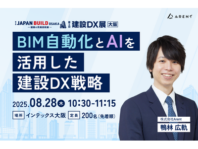 株式会社Arent(本社:東京都港区、代表取締役:鴨林広軌、東証グロース:5254)は、2025年8月27日(水)から29日(金)に開催される「第9回 JAPAN BUILD-建築の先端技術展-第5回 建設DX展 大阪」に出展し、セミナーに登壇いたします。