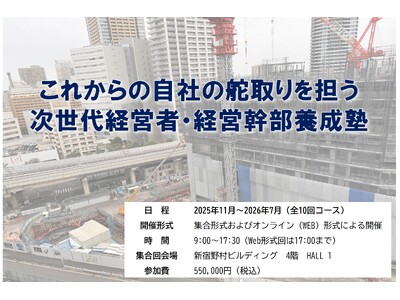 株式会社日本コンサルタントグループ(本社:東京都新宿区、社長:清水 秀一)建設産業研究所は、2025年11月から全10回コースの「これからの自社の舵取りを担う次世代経営者・経営幹部養成塾」を開講いたします。