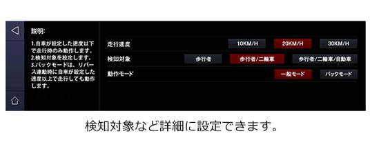 車速は設定速度(10km/h、20km/h、30km/h)以下、リアカメラの画像認識が後方より接近する車両と通行人を検知すると、モニター上のインジケーターアイコンの表示と警告音でドライバーに危険を通知します。