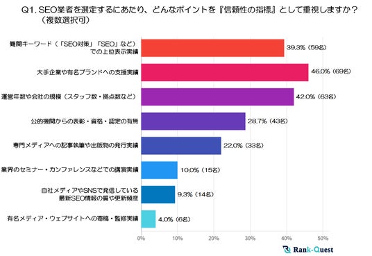大企業や有名ブランドとの取引実績を重視する声が最も多かったことから、“信頼できるSEO事業者かどうか”を判断するうえで、やはり