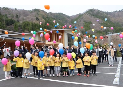 4月22日に行われた完成式では、地域住民や園児ら約150人が出席し、テープカットや風船とばし、児童生徒による合唱などで完成を祝いました。