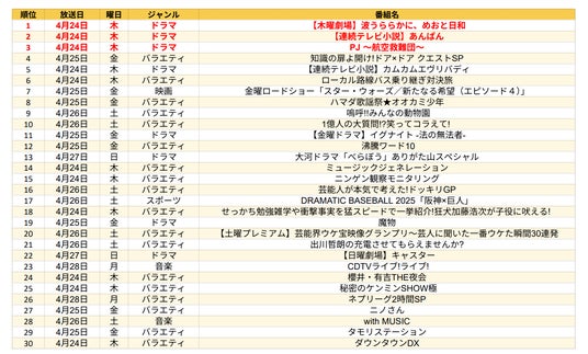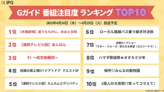 2025年4月24日(木)~4月29日(火)に放送予定の番組について、2025年4月17日(木)~4月22日(火)の6日間で発生した「Gガイド」番組詳細ページの閲覧数を集計しています。
