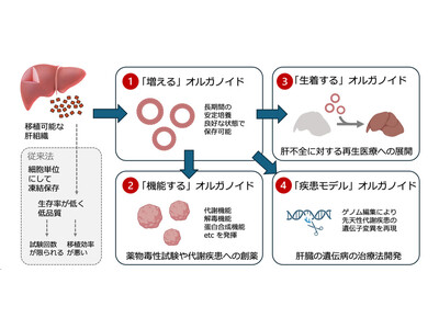 慶應義塾大学医学部医化学教室の五十嵐亮特任助教(大学院生)、小田真由美専任講師、佐藤俊朗教授らの研究チームは、肝細胞が本来持つ機能を失わずに増殖する方法を確立し、ヒト初代肝細胞からミニチュア組織である「オルガノイド」を作ることに成功しました。また、肝細胞オルガノイドは試験管の中で薬物代謝や脂質代謝等の機能を再現でき、細胞移植による再生医療への展開の可能性も示されました。