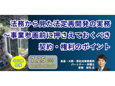 JPI(日本計画研究所)は、長島・大野・常松法律事務所 パートナー・弁護士 宮城 栄司 氏を招聘し、法務から見た法定再開発の実務~事業参画前に押さえておくべき契約・権利のポイントについて詳説いただくセミナーを開催します。