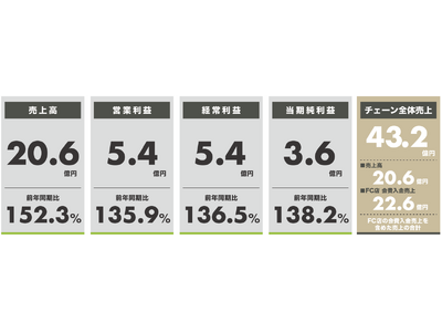 11店舗を新規出店し、売上高は20.6億円(前年同期比:152.3%)、売上高の伸長により、営業利益は5.4億円(前年同期比:135.9%)、経常利益は5.4億円(前年同期比:136.5%)、当期純利益は3.6億円(前年同期比:138.2%)を計上しました。