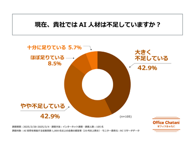 まず、「会社でAI人材は不足しているか」を尋ねる設問への回答で、1位が同率で「大きく不足している」と「やや不足している」で42.9%、次いで3位が「ほぼ足りている」で8.5%という結果になりました。1位の両回答を合計すると回答率85%を超える形となり、この結果から、大半の企業でAI人材が不足していることがわかりました。
