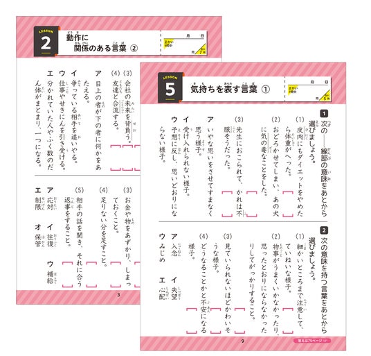 「動作」や「気持ち」といったように、ジャンルごとに分かれているので、問題を解くと同時に言葉の使い方も学べます。
