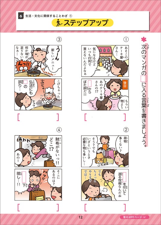 漫画を使用した問題も掲載。ことばの使用シーンのイメージがしやすく、スムーズに頭にインプットできます。