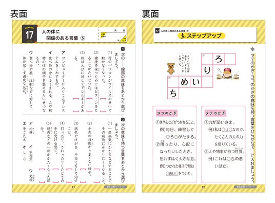 表面は選択問題、裏面は記憶に残りやすいよう、ひと工夫加えた書き込み式の「ステップアップ」。クロスワードなどパズル要素が入った問題や会話文など、発展的な問題を入れています。