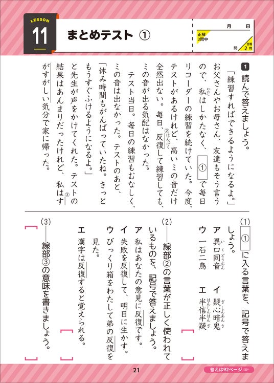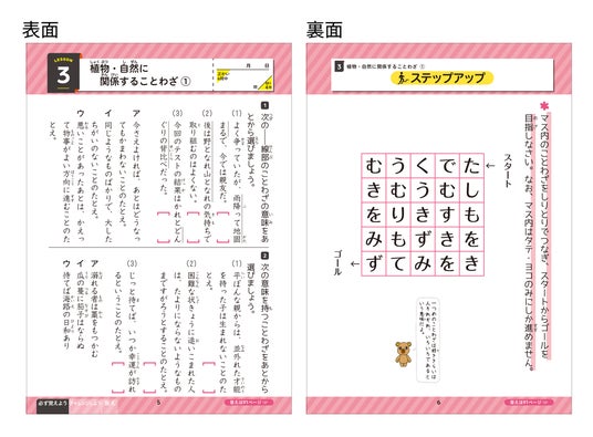 サクサク5分間の積み重ねで重要な語彙・ことわざ・慣用句が身につく復習プリントです。学期末・教科書のおさらいにも最適。小学3年生からオススメです。