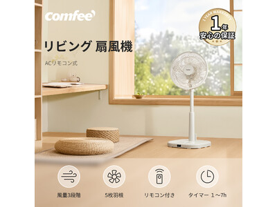 COMFEE'のリビング扇風機は、静音設計と広角自動首振り機能を備え、リモコン操作で風量やタイマーを簡単に調整可能。