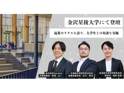 株式会社SoLabo(本社:東京都渋谷区、代表取締役 田原 広一)の代表取締役 田原 広一は、白潟総合研究所株式会社 (本社:東京都中央区、代表取締役社長:⽩潟 敏朗)の取締役副社長 石川 哲也、取締役 畦田 佑登と共に、金沢星稜大学にて大学生に向けて特別講演、大学生との対談を行います。