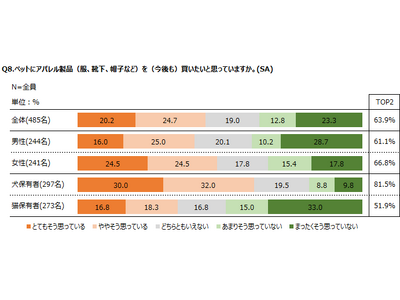 犬と猫の保有別で購入意向を比べると犬保有者(81.5%)が猫保有者(51.9%)を大きく上回っているる。また男女別では男性(61.1%)と女性(66.8%)はほぼ同レベルだが、「とてもそう思っている」だけで比べると女性(24.5%)が男性(16.0%)を8.5ポイント上回っている。ペット用アパレル製品の購入に積極的なのは「女性」と「犬保有者」である。