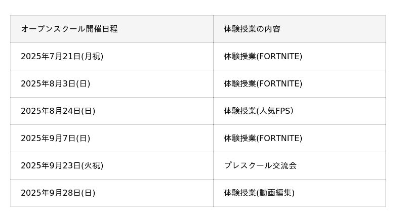 オープンスクールではカリキュラムや当学院の特徴についてご案内する他、高校の学習についても説明します。加えて、プロ講師による「FORTNITE」や人気FPS、動画編集の無料体験授業も実施しています。新入生だけでなく、転校生も積極的に歓迎していますので、eスポーツに興味のある中学生、高校生の方は、ぜひ一度お越しください。