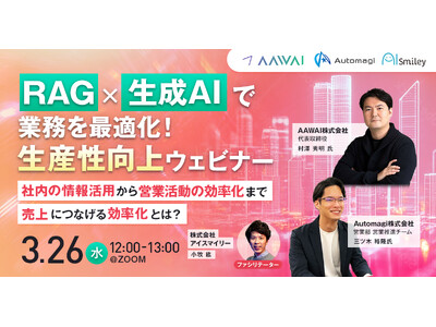 AIポータルメディア「AIsmiley」を運営する株式会社アイスマイリー(東京都渋谷区、代表取締役:板羽晃司)は2025年3月26日(水)12時からRAG×生成AIをテーマにウェビナーを開催します。