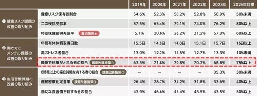 ネスレ日本では、健康経営※2の重要課題のひとつとして「働き方とメンタル課題の改善の取り組み」を掲げていますが、指標である「睡眠で休養がとれる者の割合」の増加に向けた課題改善施策として、「ネスレ ヘルスサイエンス睡眠プログラム with Fitbit」を取り入れています。