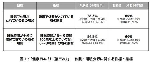 厚生労働省が進める「健康日本21(第三次)」においても、休養・睡眠分野に関連する目標として「睡眠で休養がとれている者の増加」及び「睡眠時間が十分に確保できている者の増加」が設定されています。令和14年の目標値達成に向けて、今後も睡眠の質・量の課題解決は進められていくと考えられます。