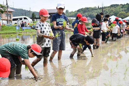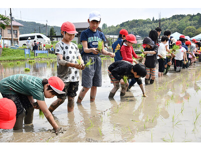 この日の田植えは、全校児童に加え、近隣農家や保護者が参加。児童たちは、水の張られた田んぼに入り、先生からの「3から5本の苗を鉛筆のように持って、根っこが土の中に入るようしっかりと植えてください」などの説明を受けたあと、キヌヒカリの苗を植えていきました。手慣れた様子の上級生に比べ、初めて田植えを体験する1年生はなかなか思い通りにいかず悪戦苦闘していました。それでも上級生らに教えてもらうと、見る見るうちに上達。顔や手に泥をつけた児童は「水は少し冷たいけれど、気持ちいい」と話し、みんなで汗を流しながら田植え体験を楽しみました。今後、苗の成長を観察し、秋には児童全員で刈り取りを行う予定です。