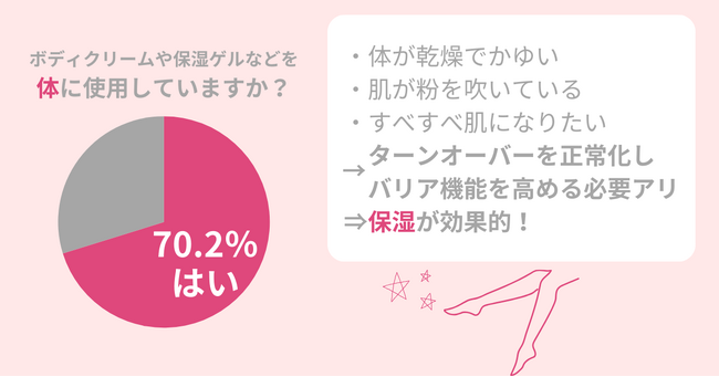 70.2%の女性がボディクリームや保湿ゲルなどで、体を保湿している